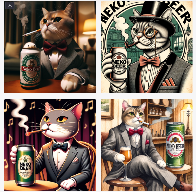 タバコを吸っているダンディーな猫が缶ビールを飲んでいる姿を書いて。缶ビールには「neko beer」と書いてある。